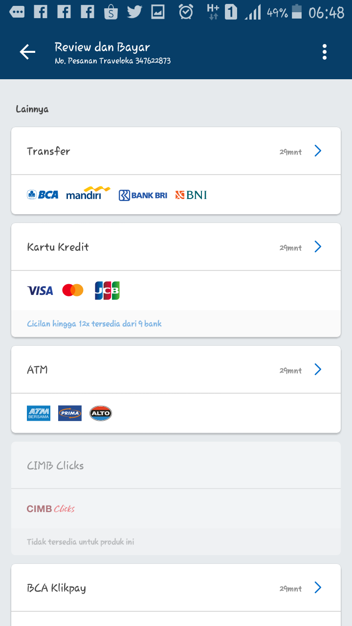 Disini kamu tinggal memilih mau metode pembayaran seperti apa. Kalau punya kartu kredit tinggal membayar dengan kartu kredit. Kalau mau menggunakan internet banking, kamu tinggal membayarnya dengan menggunakan mekanisme Clickpay atau Tranfer. Mau menggunakan ATM atau Mobile Banking juga bisa. Atau mau ke minimarket terdekat juga bisa. Kamu akan diberi waktu 29 menit untuk melakukan pembayaran.
